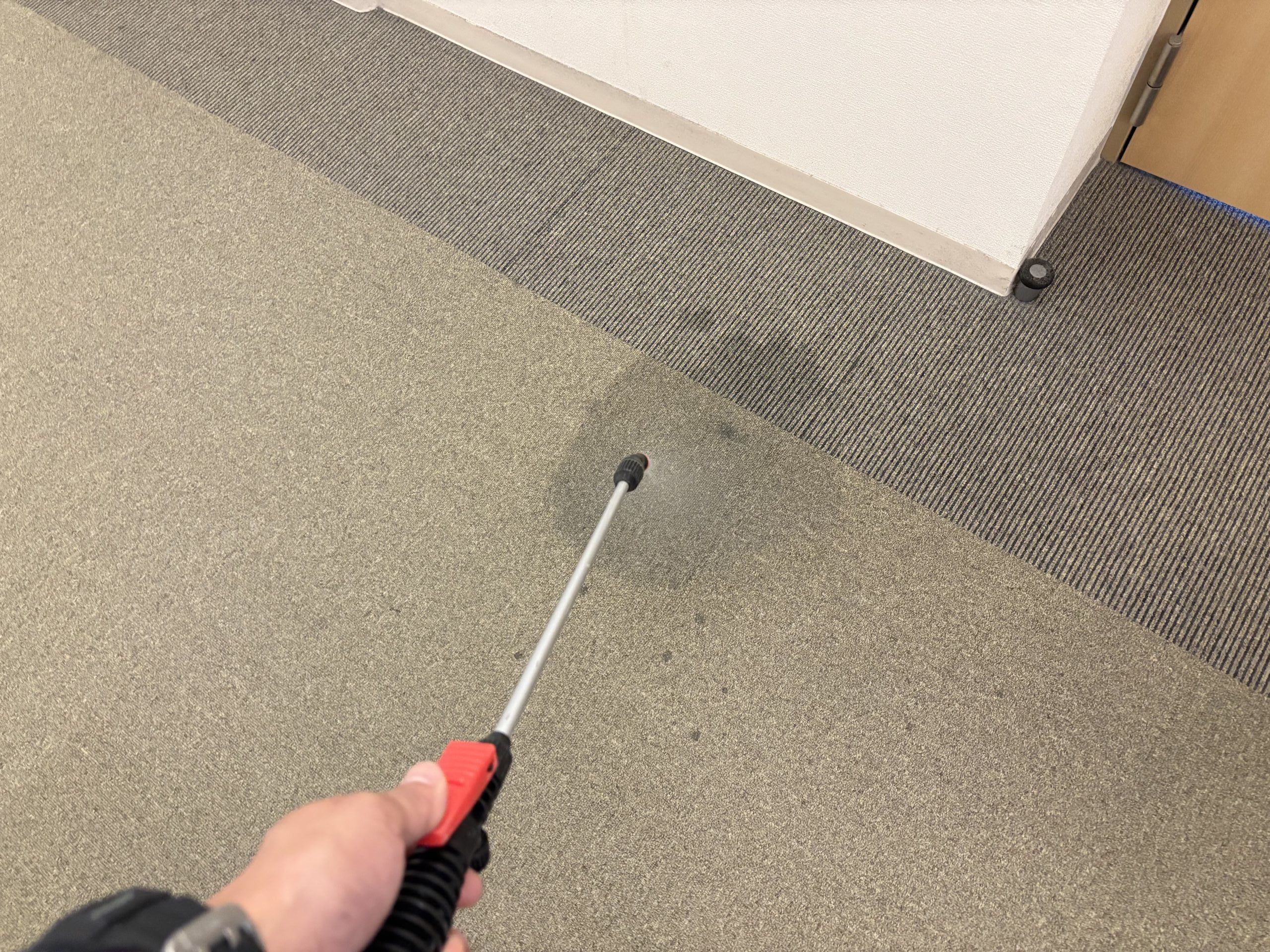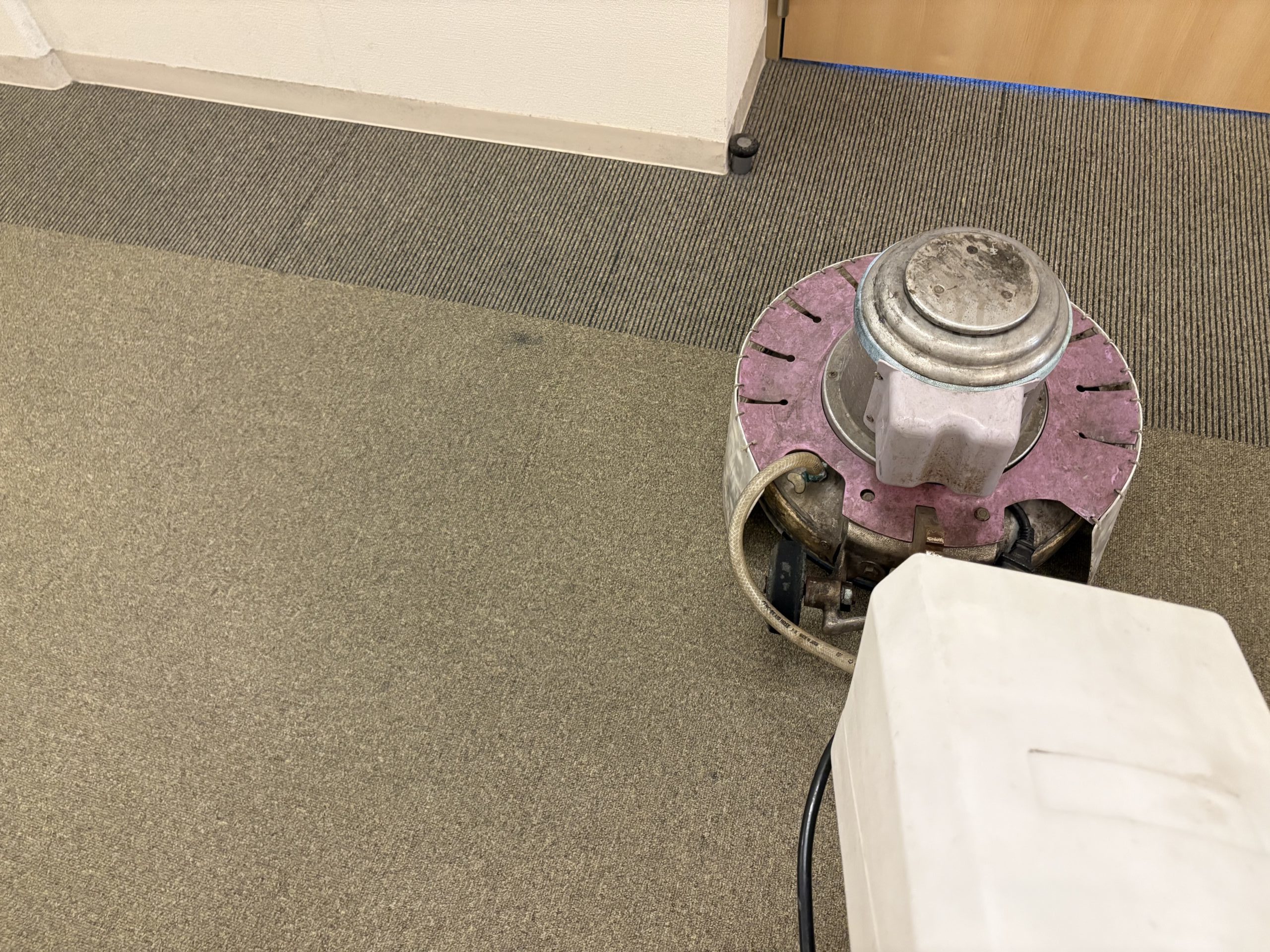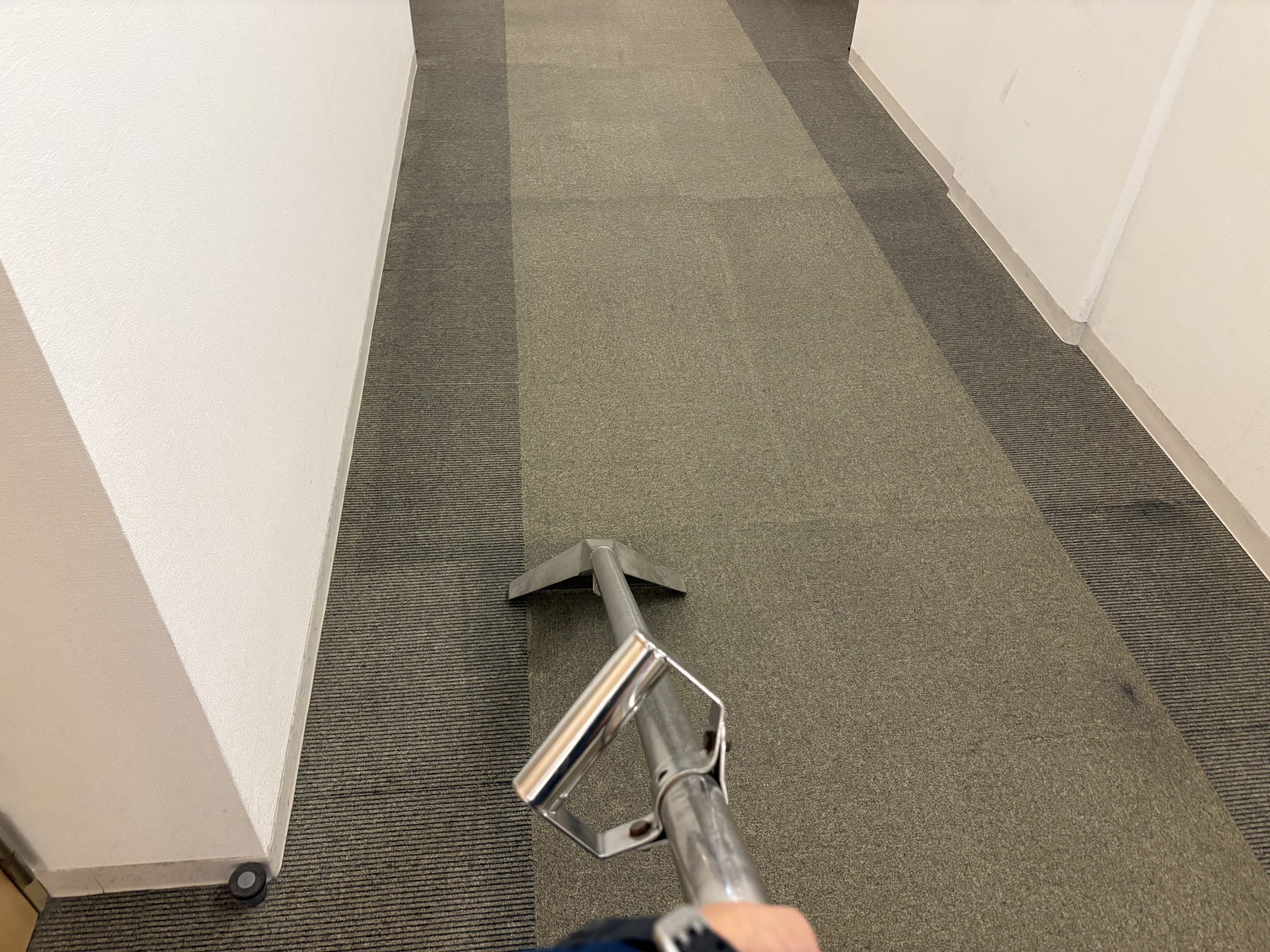 当社では、ポリッシャーによる前処理洗浄、リンサーを使用したすすぎ・回収作業を実施し、カーペット内部の汚れと水分をしっかり除去しました。